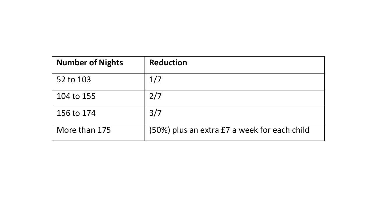 For example, if your children stay with you on Friday and Saturday night each fortnight, this would add up to 52 nights per year. This would reduce the weekly child support payment by one-seventh.